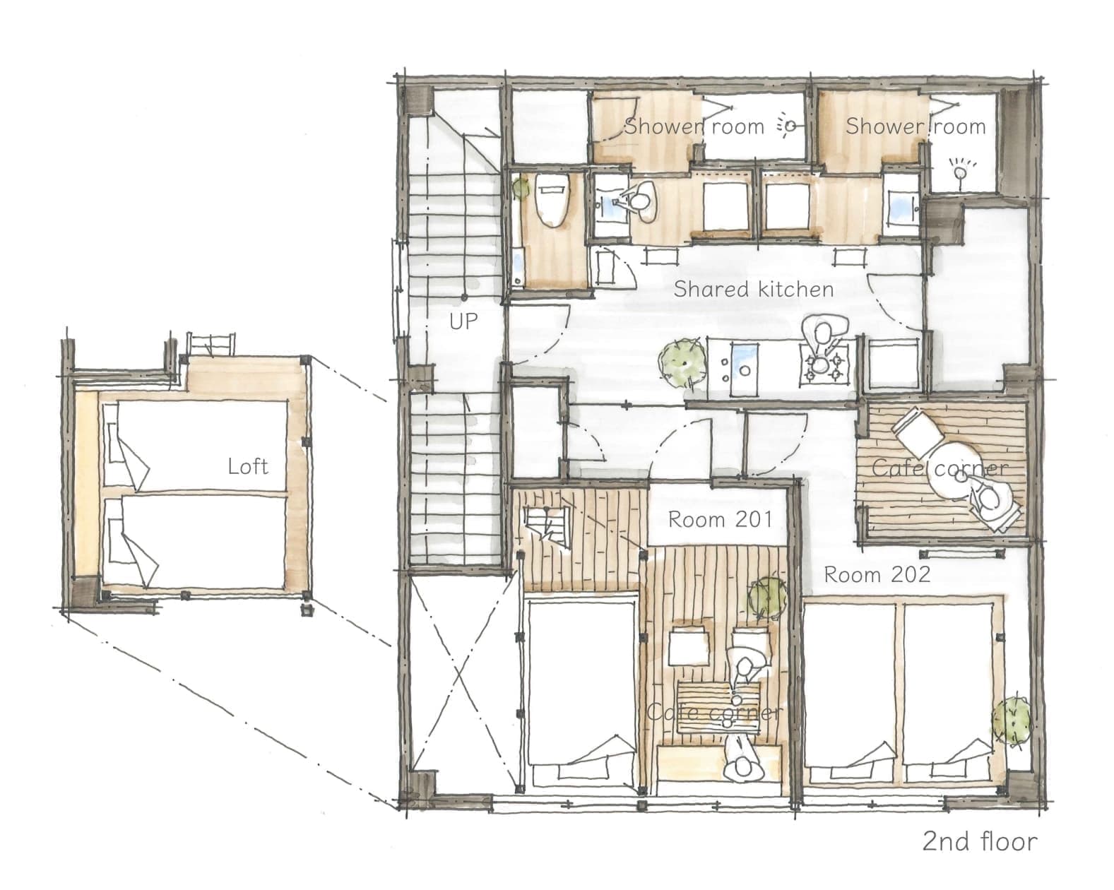 カフェテーブルのある部屋カフェテーブルを見る質素ですが丁寧につくりました ロフト 天然のオーク材をワトコオイルで仕上げました マルハチ製の羽根布団 調度品にも拘っています ステンレス天板のコーヒーテーブル